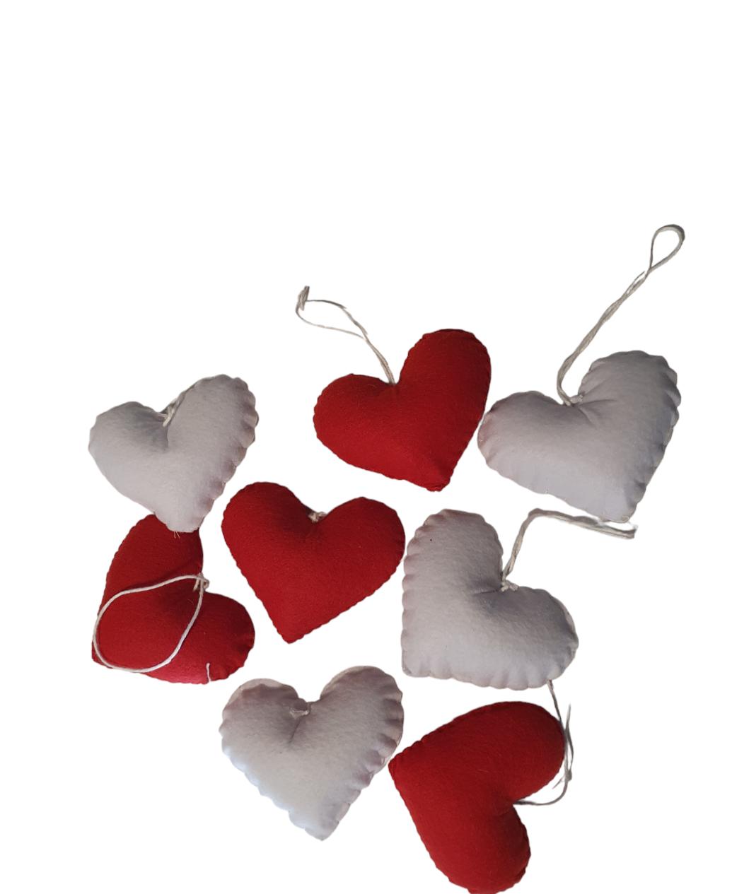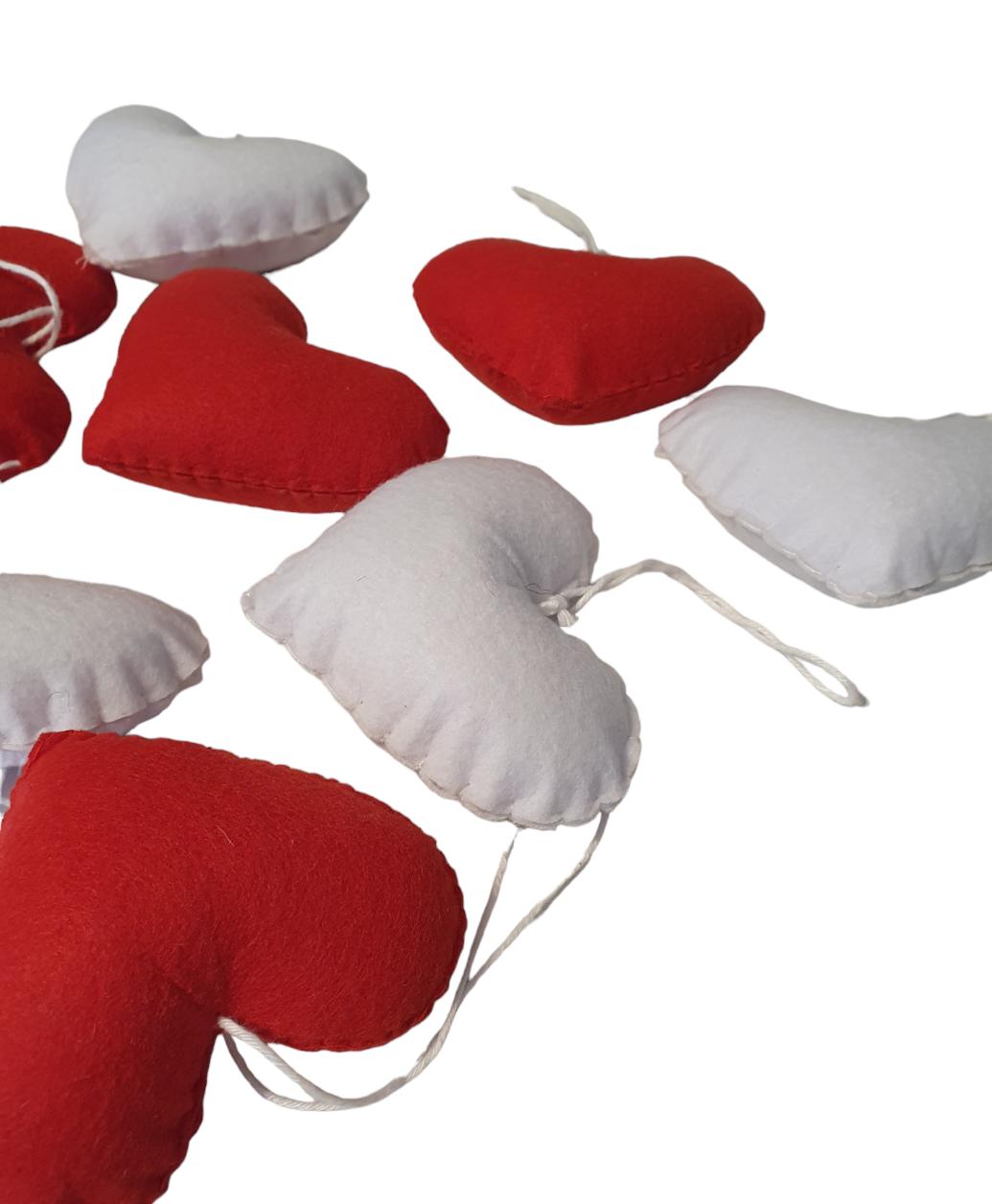 De hartjes zijn ongeveer 9cm breed en 3cm hoog. Gemaakt van 100% duurzaam vilt – een veelzijdig en tijdloos materiaal. Voorzien van een lusje om ergens op te hangen, of te gebruiken als sleutelhanger. Als set van 10 stuks verkrijgbaar in een combinatie van rood en wit, maar ook als set in 5 stuks in alleen rood.